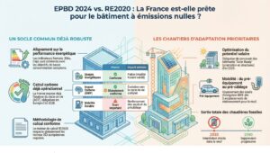 La RE2020 est déjà très largement alignée avec les objectifs européens de la directive sur la performance énergétique des bâtiments (DPEB 2024/1275) concernant les bâtiments à émissions nulles (Zero Emission Buildings – ZEB).